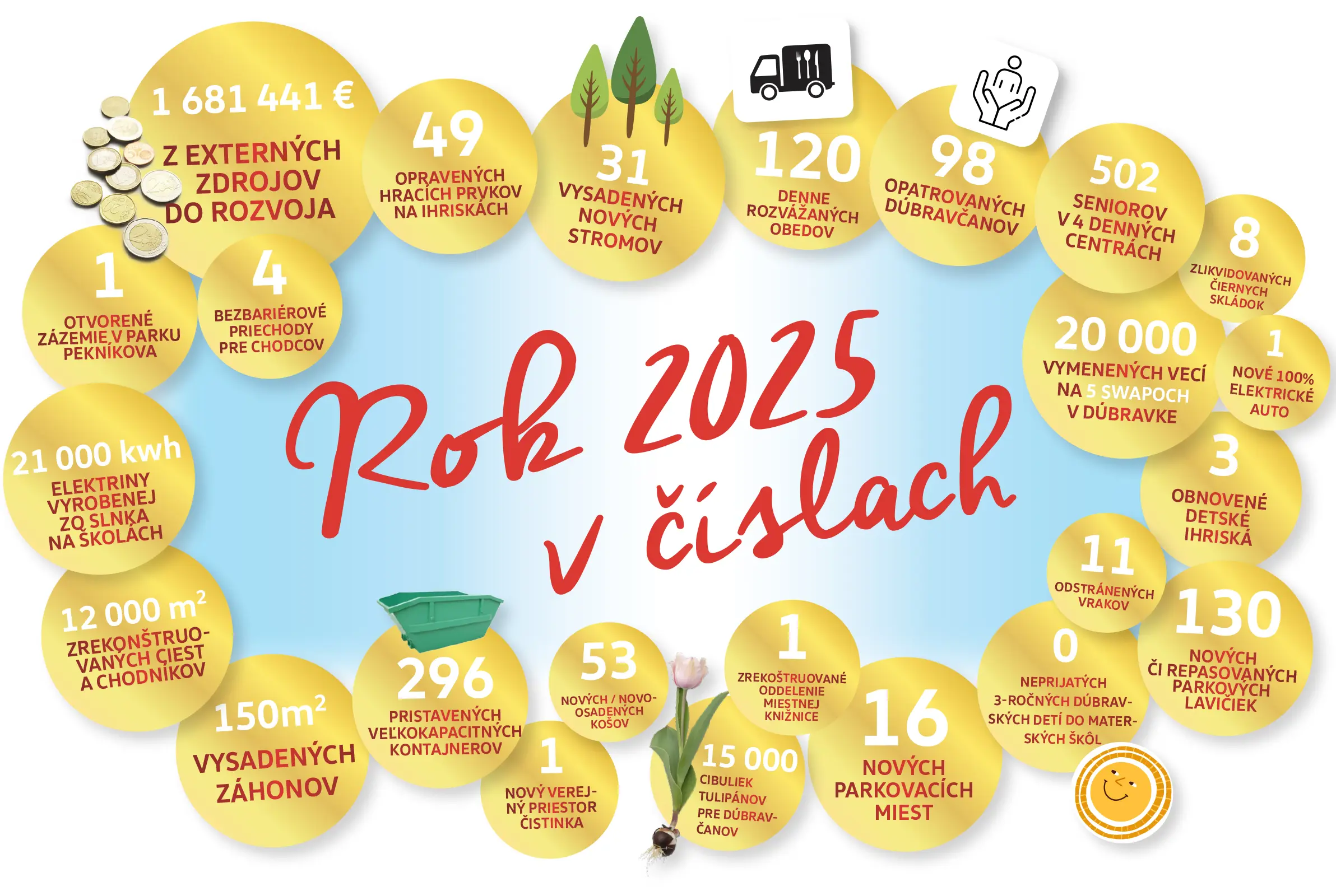 Plánov, potrebných opráv, zanedbaných verejných priestorov je stále dosť. Mestská časť podala viaceré granty a reagovala na mnohé výzvy, pri niektorých už čaká na výsledok. Budeme držať palce, nech pestrý prehľad čísiel a projektov budeme môcť napísať aj o rok.